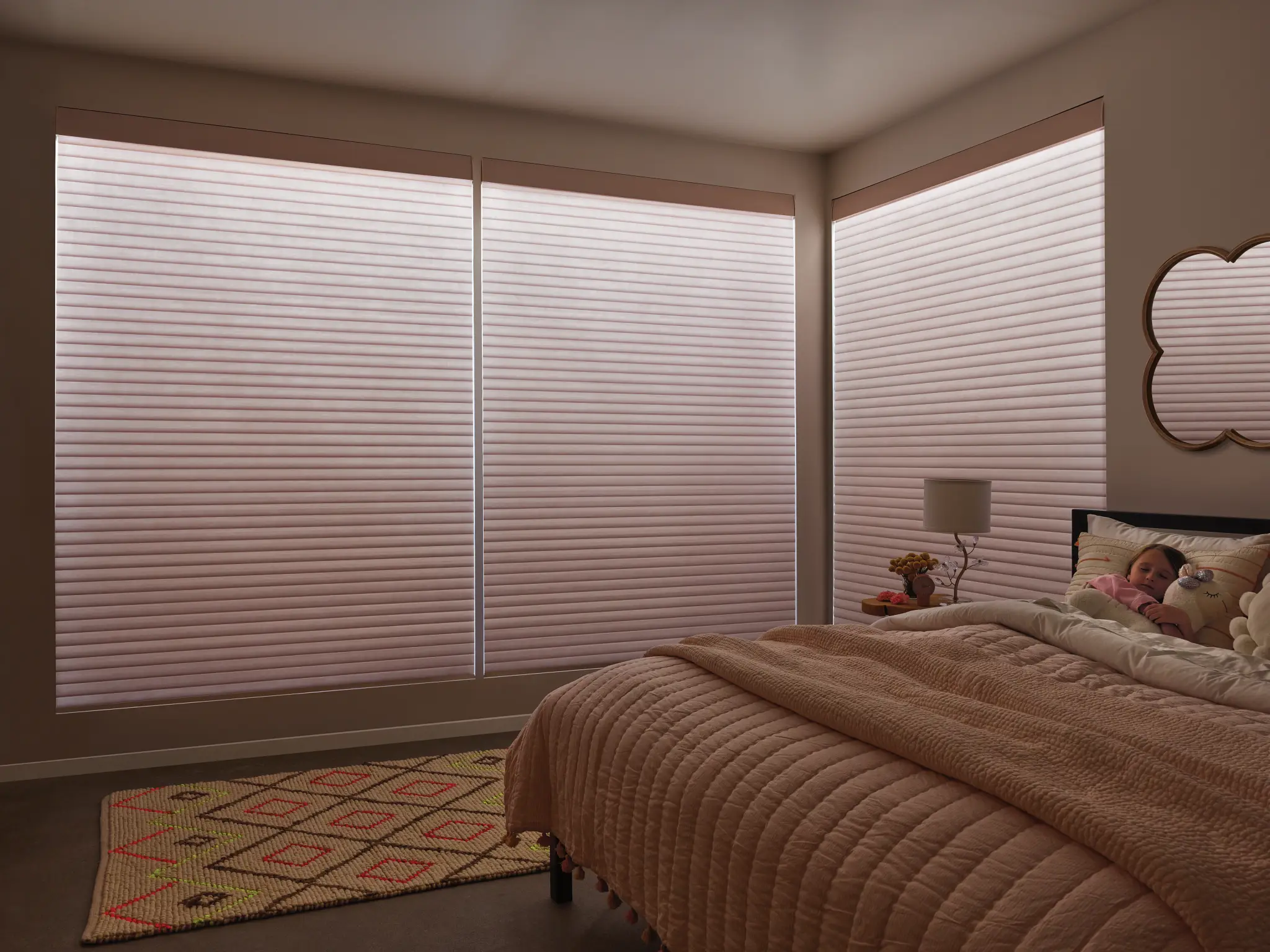 The innovative design of Aura Illuminated Shades features a textured front shade and a room-darkening liner, along with built-in illumination.